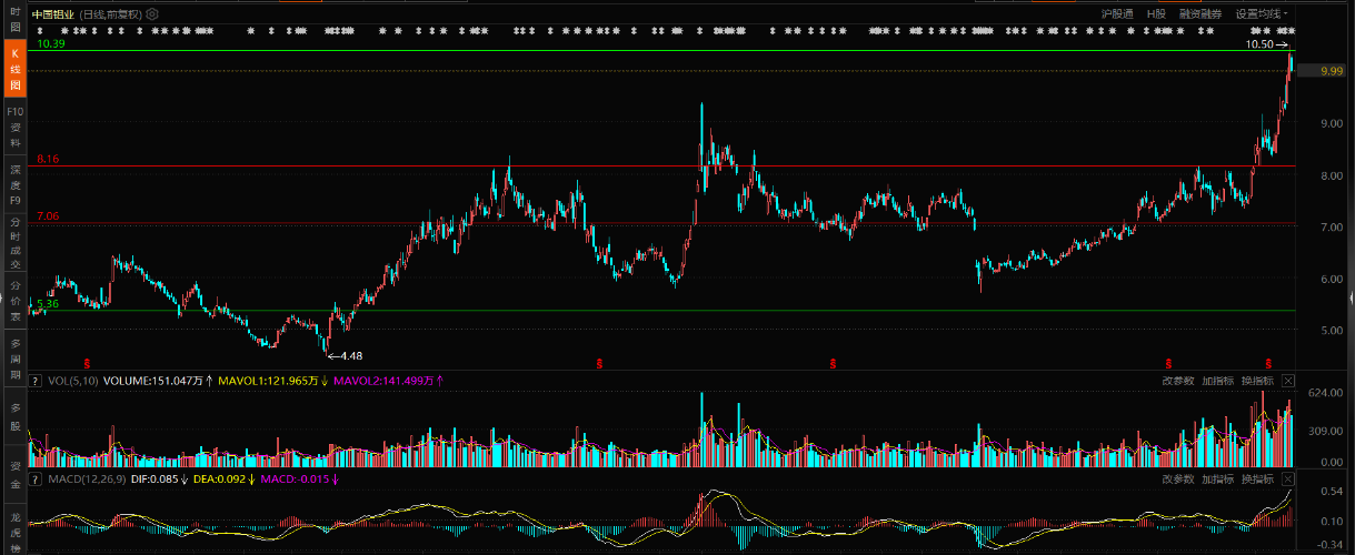 说说中国铝业。我从6.5一路持有,现在将突破14年新高,这一路走来并不平坦,现在10.3左右出了一半,因为这高点就是10年前新高,如能下来到9.5左右我还会补回。如不下来了那就算了,但我还是看好的,如向上能有效突破,我想大家都懂的会到15至20元,从今天的走势来还是比较健康的,既然能拉到15年的新高,多数不会就此结束。就走着看吧。