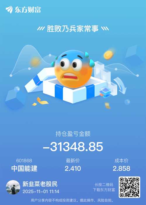 $中国能建(SH601868)$ 跌的真疼。这仨月真练心,比读几本经书还受教。卖块黄金接着陪你玩。投资中国,就是投资未来。本想打个短,又做成股东了。还是需要拿点钱玩顺势股,贴补一下。不过今天走的在同行业中算强的,板块起来,你也有戏做龙头。不信你骨子里的连板基因就出现一次。机构对季报的反应真不友好,跟量化玩是有难度。非研究出个专门收割量化的模型。