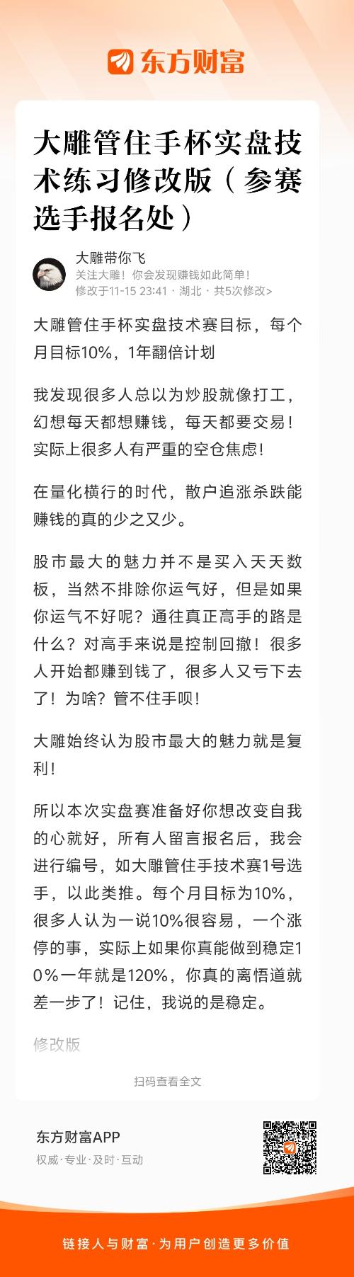 $永鼎股份(SH600105)$$博纳影业(SZ001330)$$永辉超市(SH601933)$雕粉们,如果你们能抽时间把大雕带你飞与大雕来咯上面所有的学习类视频看看,一定能学到不少东西。还是那句话,知行合一,你得先知道再做到!祝你成功