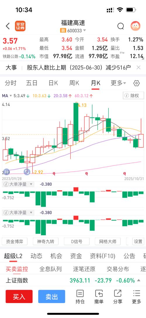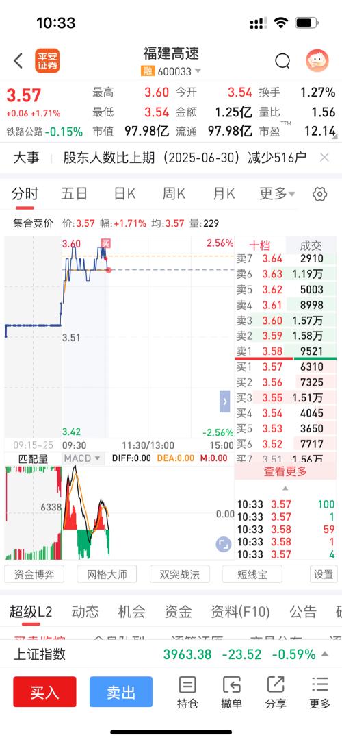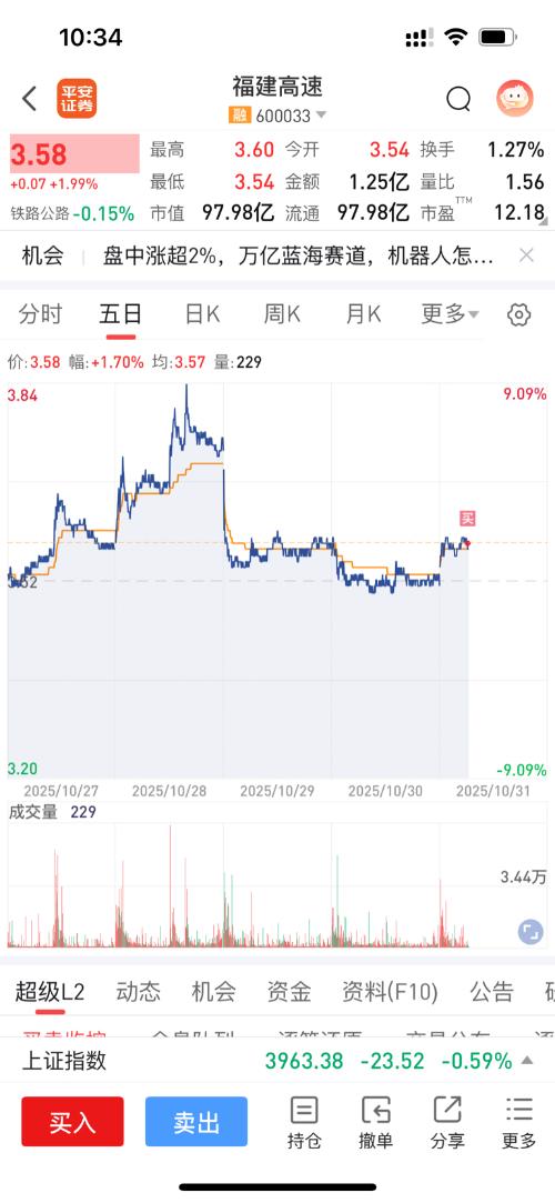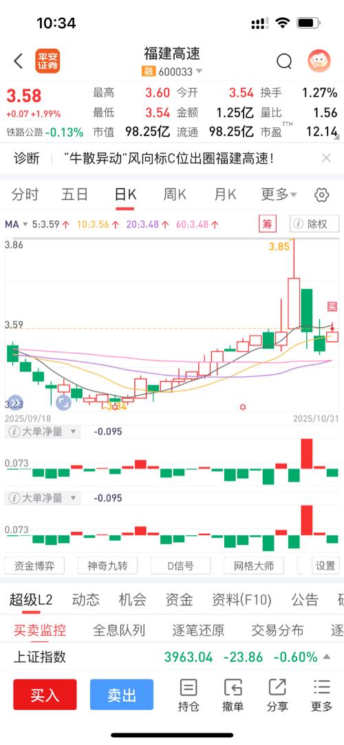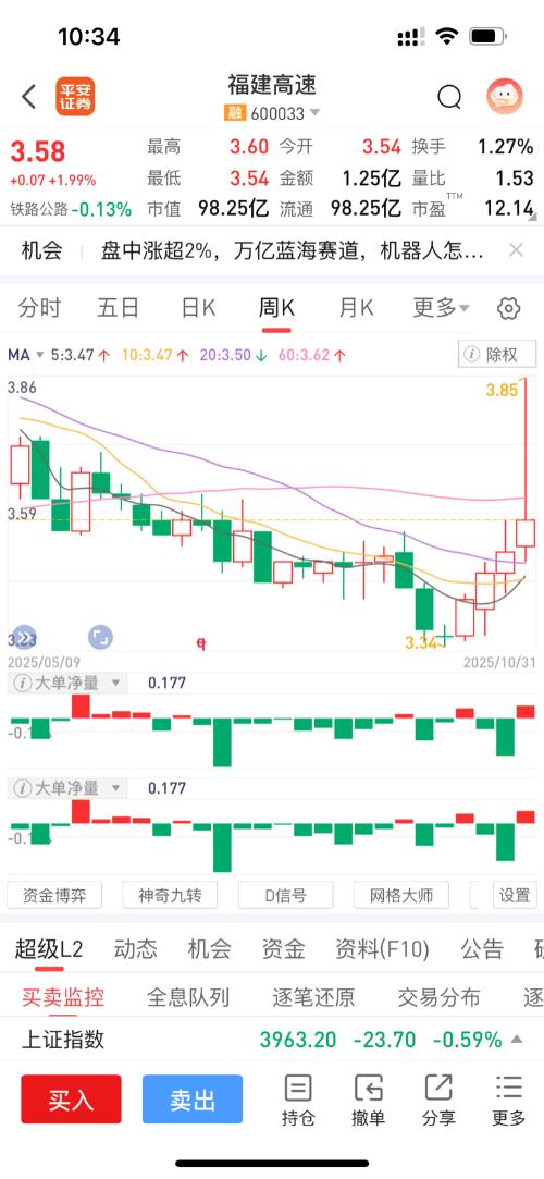 $福建高速(SH600033)$$福达股份(SH603166)$$上证指数(SH000001)$卖掉福达后,犹豫了一个早上,决定24手建仓福建高速。 从技术面、基本面和资金面综合分析,你在3.58元建仓的操作有一定合理性,以下是具体分析及下周收益预期: 一、建仓合理性分析 1.技术面支撑 股价处于5日、10日、20日、60日均线多头排列的上升趋势中,3.58元处于近期成交密集区,有一定支撑力度;从...