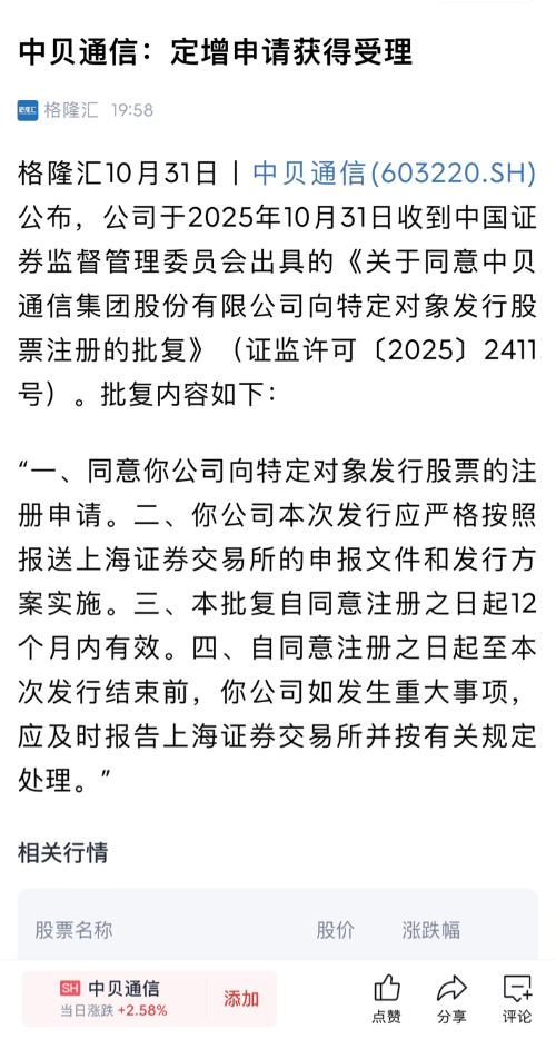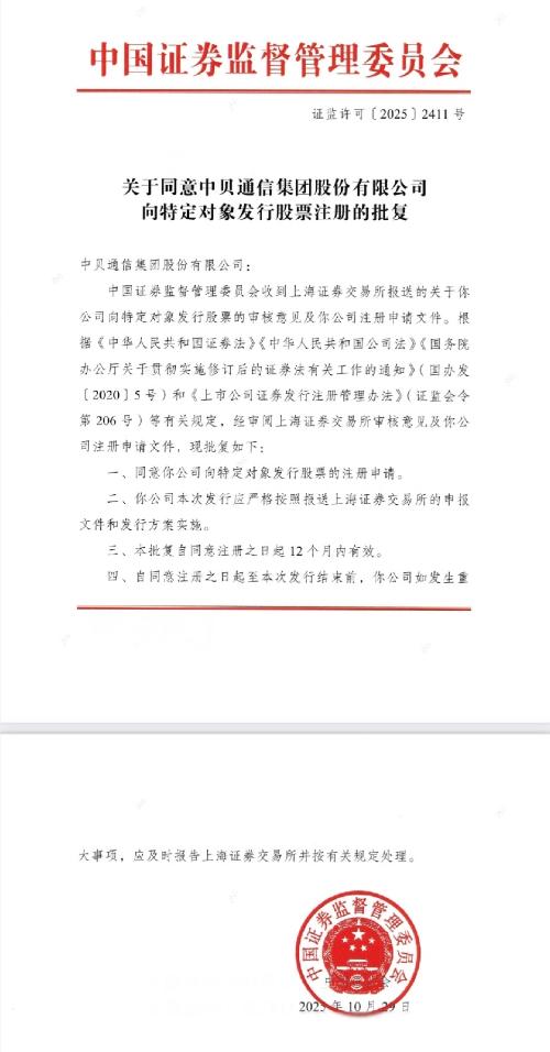 智通财经 更新于 10-31 19:53 529次浏览 中贝通信(603220.SH)向特定对象发行股票申请获证监会同意注册批复 中贝通信(603220.SH)发布公告,公司于2025年10月31日收到中国证券监...中贝通信(603220.SH)发布公告,公司于2025年10月31日收到中国证券监督管理委员会出具的《关于同意中贝通信集团股份有限公司向特定对象发行股票注册的批复》(证监许可〔2025〕2411号),同意公司向特定对象发行股票的注册申请。 16