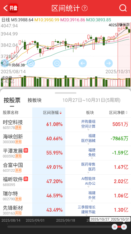 $平潭发展(SZ000592)$$海峡创新(SZ300300)$$福昕软件(SH688095)$ A股在4000点关口反复拉锯之际,福建板块突然杀出重围,10月31日收盘掀起凶猛涨停潮:海峡创新20.02%涨停斩获5天3板,成交金额超26.8亿元,福昕软件同步20%涨停,冠城新材、福建水泥等10余股强势封板,板块内超20只个股涨幅超8%,成为震荡市中最耀眼的主线。这场资金狂欢的背后,是政策、产业、...