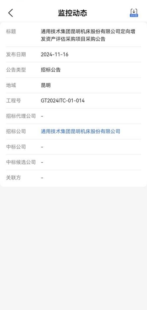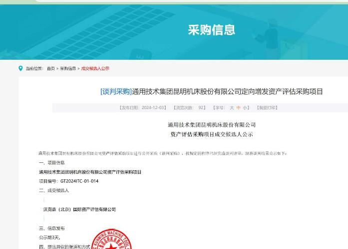 请看图片,这个事件是通用技术集团昆明机床股份有限公司定向增发资产评估采购项目的招标进展: 一、当前进展:处于“招标实施→评估服务启动”阶段 项目于2024年11月16日发布采购公告(项目编号:GT2024ITC-01-014),采购方式为“谈判采购”,要求供应商需在2024年11月21日前递交响应文件,并于当日完成谈判。 目前未公开中标结果,但结合采购流程(央企采购通常在谈判后1-2周内确定成交方...