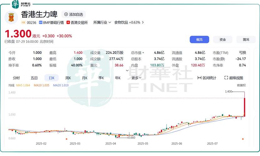 7月29日,香港生力啤(00236.HK)股价大幅拉升,盘中一度涨40%,截至收盘涨幅为30%,报1.3港元/股。 究其原因,该股走势强劲,源于业绩利好的刺激。 7月28日,香港生力啤公布了2025年中期业绩报告,盈利修复显著。 报告期内,公司实现收入约3.90亿港元,同比增长3.22%;归母净利润为4964.4万港元,同比大幅增长31.97%;毛利率提升至39.9%,较2024年同期增加3个百分...