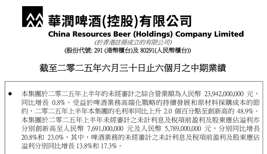 8月19日,华润啤酒披露中期业绩报告,今年上半年,华润啤酒实现营业额239.42亿元,同比增长0.8%,股东应占溢利同比增长23%至57.89亿元。 带动业绩向上的依旧是啤酒业务。报告期内,华润啤酒的啤酒业务营业额同比增长2.6%至231.61亿元。 报告期内,华润啤酒实现啤酒销量约648.7万千升,同比上升2.2%,高端啤酒产品持续发力,次高及以上啤酒销量同比...