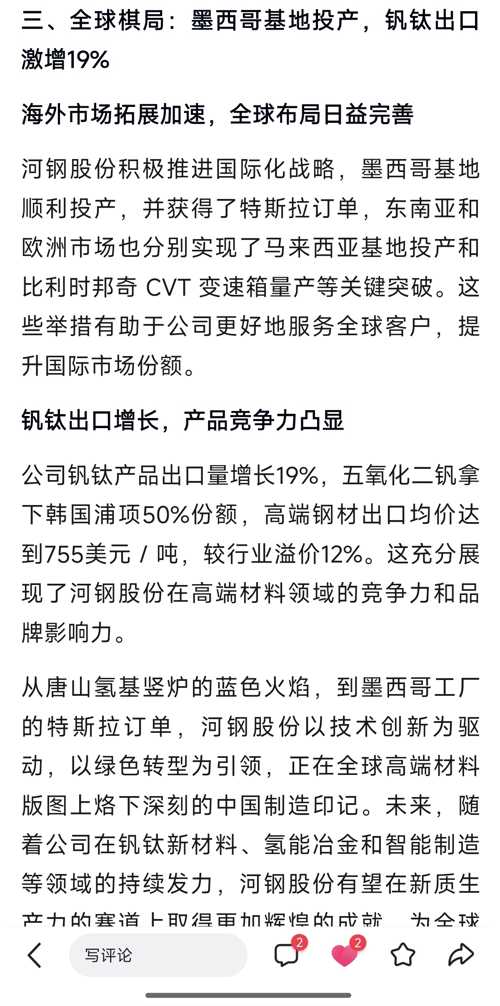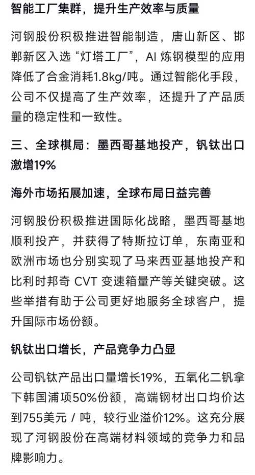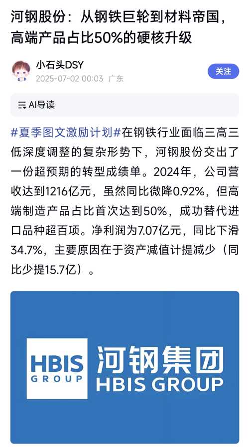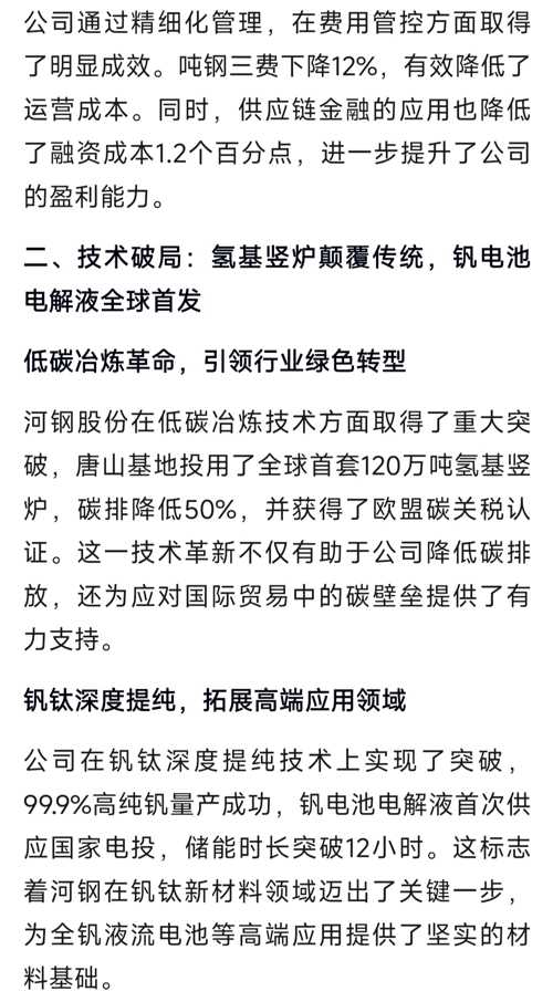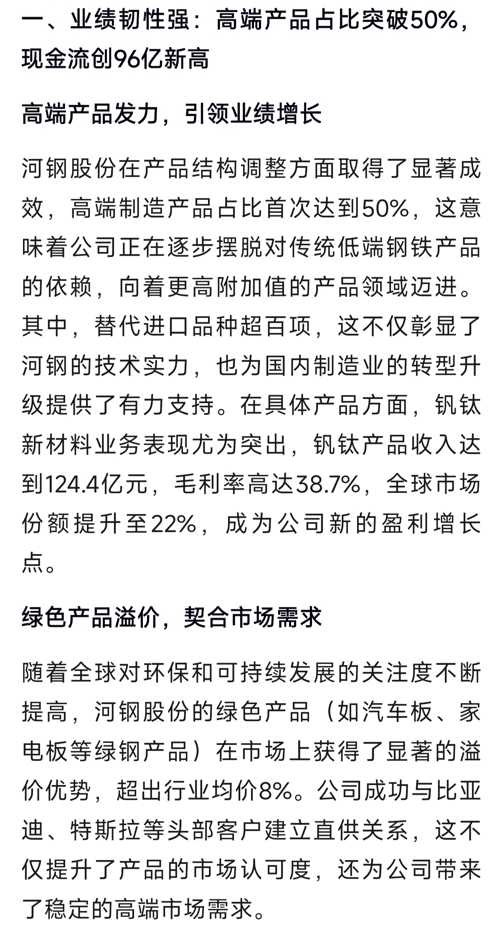 $河钢股份(SZ000709)$ 河钢股份:从钢铁巨轮到材料帝国,高端产品占比50%的硬核升级 一、业绩韧性强:高端产品占比突破50%,现金流创96亿新高 高端产品发力,引领业绩增长 河钢股份在产品结构调整方面取得了显著成效,高端制造产品占比首次达到50%,这意味着公司正在逐步摆脱对传统低端钢铁产品的依赖,向着更高附加值的产品领域迈进。其中,替代进口品种超百项,这不仅彰显了河钢的技术实力,也为国内...