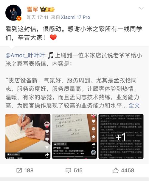 80岁爷爷手写表扬信暖到雷军!网友:给爷爷留个小米车名额呗? 最近小米之家的一桩暖心事,把不少人都看“暖透了”——80岁的吴钢爷爷,特意手写了一封表扬信,专程送到了店里。 信里的字一笔一划透着认真:“贵店设备新,气氛好,服务周到。尤其是孟孜怡同志,服务态度好、质量高,让顾客体验到热情、温暖、有家的感觉。”末了还郑重落上自己的名字和日期:2025.11.25。 收到信的店员孟孜怡,是个刚入职116天...