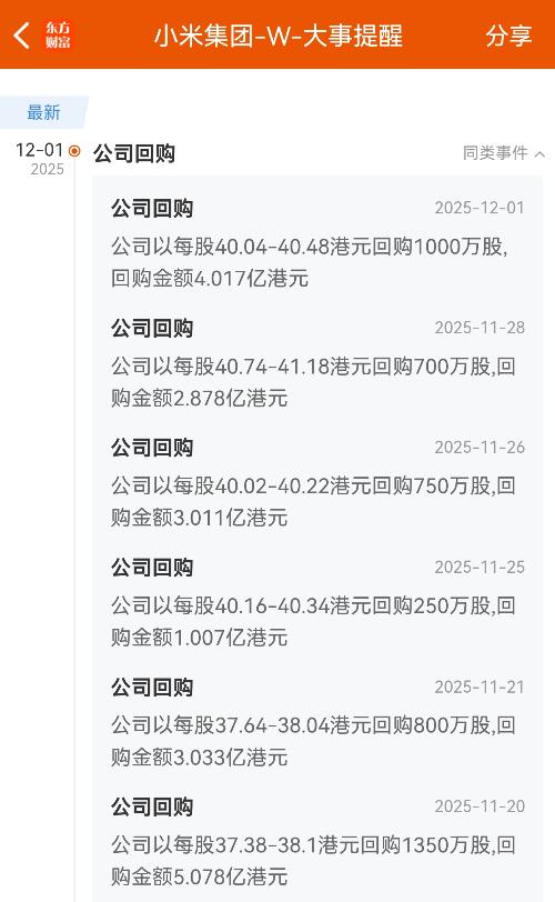 今天大盘低迷,小米也不好过!虽然最近小米利好一波接一波(回购,11月销量,现车选购功能等)但小米股价丝毫没有起色。 今天盘后,小米集团-W(01810.HK)在港交所发布公告称,当天耗资约3.02亿港元回购7500000股股份。这是小米进入十二月份连续三天疯狂回购,最近更是回购了近十次。但股价却丝毫没有反应,这让雷总犯迷糊了,以前雷总一出手立马引起轰动,带动一波抢购潮。 要知道,小米汽车11月交付...