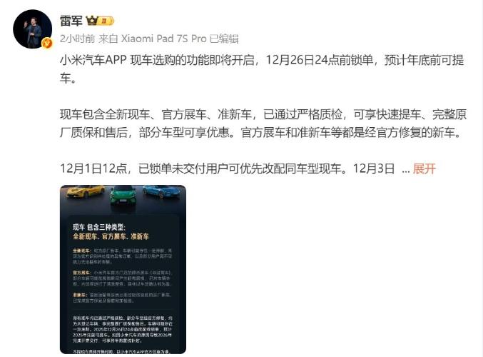 雷总微博又出新消息了!小米汽车APP现车选购的功能即将开启,如果客户在12月26日24点前锁单,那么预计年底前可提车。(我有点懵逼,又是现车又是年的) 据报道,这些现车包含全新现车、官方展车、准新车,已通过严格质检,可享快速提车、完整原厂质保和售后,部分车型可享优惠。官方展车和准新车等都是经官方修复的新车。感觉这表述有点弯弯绕绕的,准新车,部分可享优惠,官方修复…、…,消费者要的是真诚啊,军哥! ...