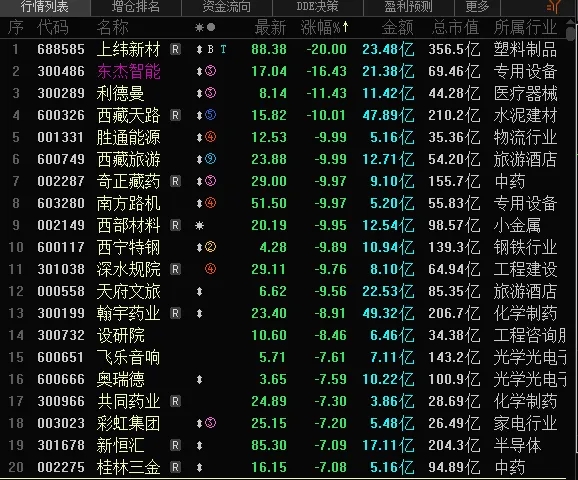 上纬新材20CM跌停,昨天复牌顶风拉20CM大涨停,晚上利空加倍,今天20CM大跌停,彻底的顶部了。东杰智能止步3板20CM,大跌16.43%,整个高标都遭受打击,这两个是机器人方向,今天机器人暴涨,8月最强主题。 医药方向,今天全A行业跌幅榜前六全是医药相关,个股方面,利德曼大跌11CM,奇正藏药跌停板,上周领涨本周领跌;翰宇药业大跌8CM,共同药业大跌7CM,高标趋势股悉数调整。7月医药涨幅最...