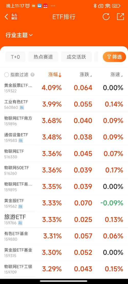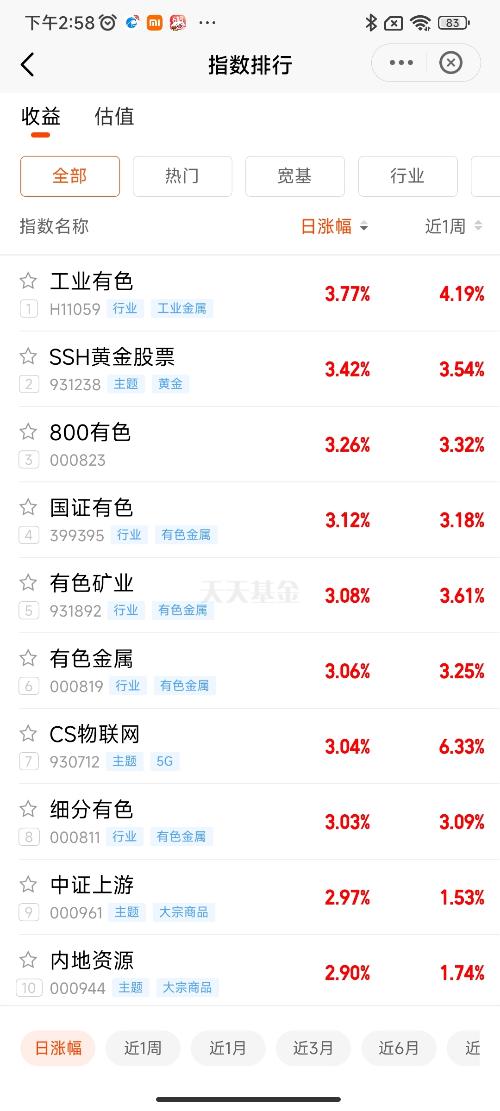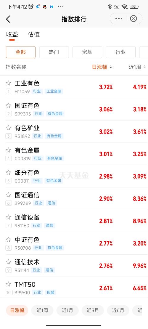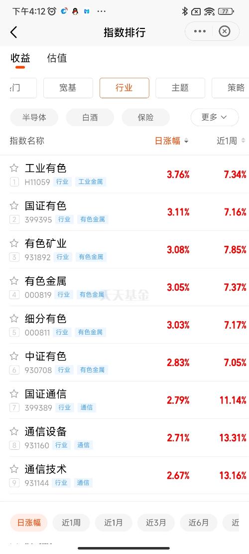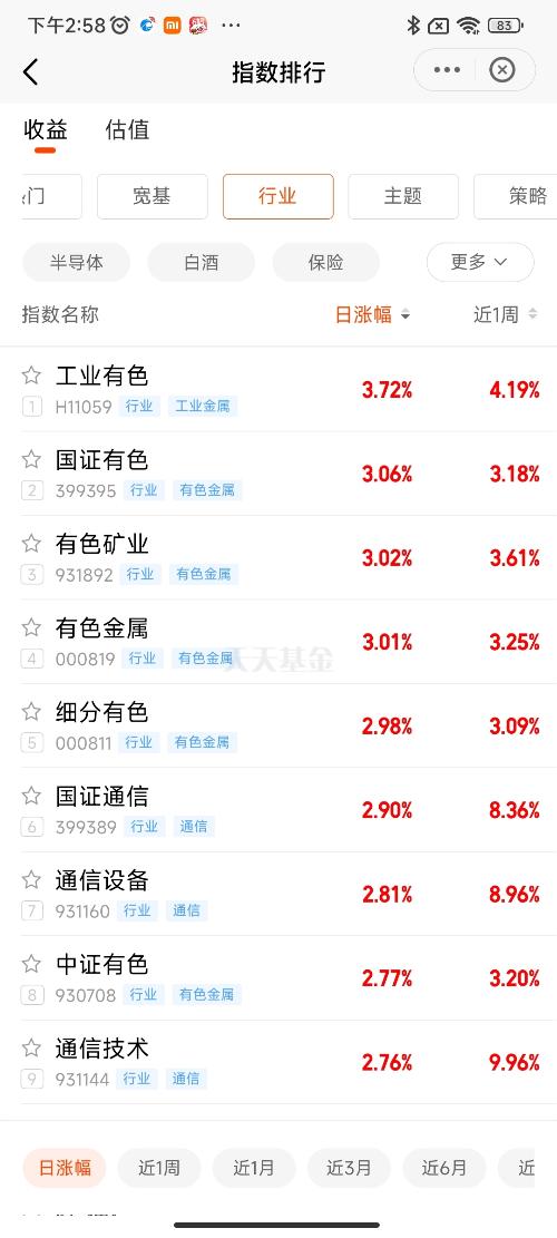 A股pm2:57后《指数宝》:《工业有色》指数,第一。《有色金属》行业,第二。《通信》行业,第三。 A股收盘后《etf排行》:1个和》国证有色》指数相关、4个和《cs物联网》指数相关、1个和》通信设备主题》指数相关、3个和”港股”指数有关、《中证旅游》指数、《物联网50》指数无相关指数基金。 a股pm2:57后《行业排行》:《消费电子》行业,第一。《电子化学品》行业,第二。《贵金属》行业。第三。《...