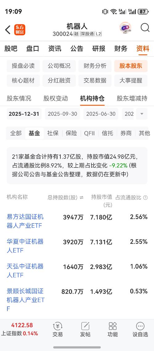 $机器人(SZ300024)$虽然25.12月末公募基金揭晓持仓新松机器人占比市值9%左右,同比其他占比超高,但这并不代表未来发展可期,仅表明曾经一波高涨行情走势已走完…公募静等韭友们接盘罢了(公募基金持仓占比:24.9月末持仓占比仅小于3%~24.12及25.3月持仓均占比6%~25.6及25.9月9月末持仓均占比10%~25.12末持仓占比9%)$人形机器人(BI1184)$