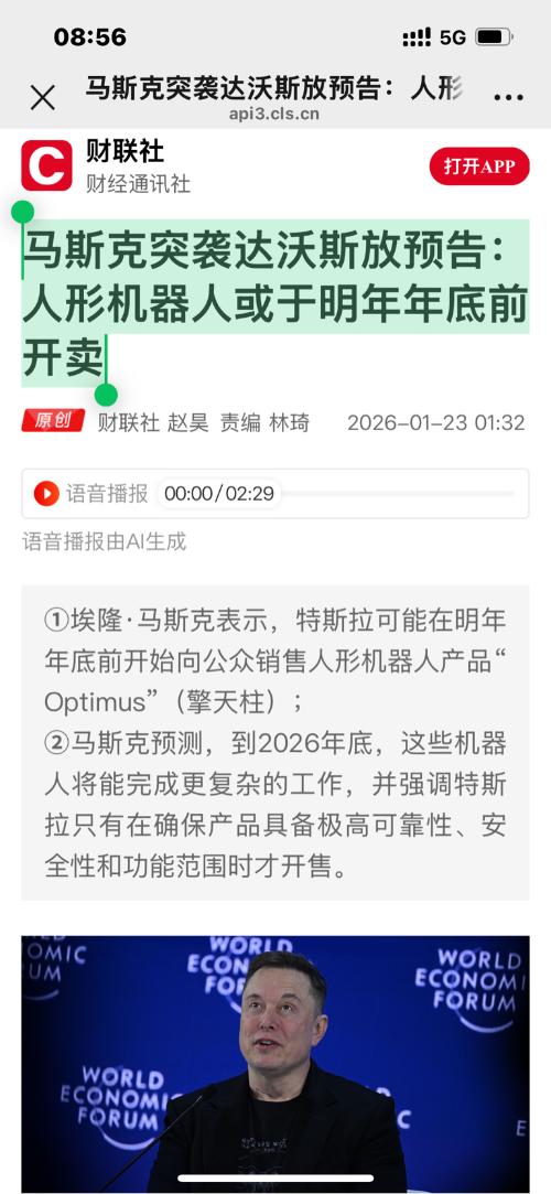 全球人形机器人赛道,正式进入“特斯拉时间”。 就在刚刚,特斯拉CEO马斯克现身达沃斯瑞士达沃斯世界经济论坛,抛出了一系列足以震惊科技界与资本市场的重磅消息。 这其中,有关人形机器人Optimus的信息无疑最令人震惊。 这位一向以颠覆性言论著称的企业家,在对话中明确给出了Optimus人形机器人的商业化时间表:明年年底将向公众出售。这一表态直接将Optimus推向了消费市场倒计时。 马斯克突然现身,...