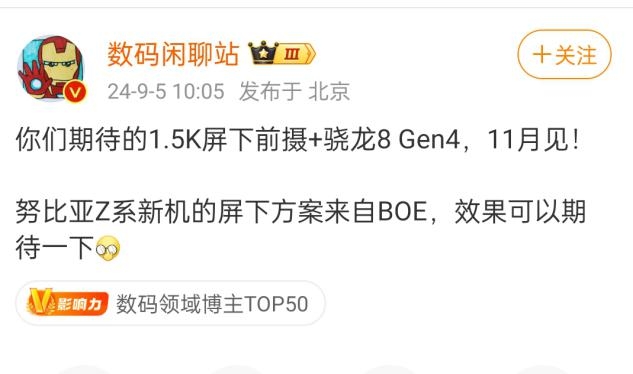 2024最强全面屏!1.5K屏下摄像+骁龙8Gen4,努比亚Z70 11月发布