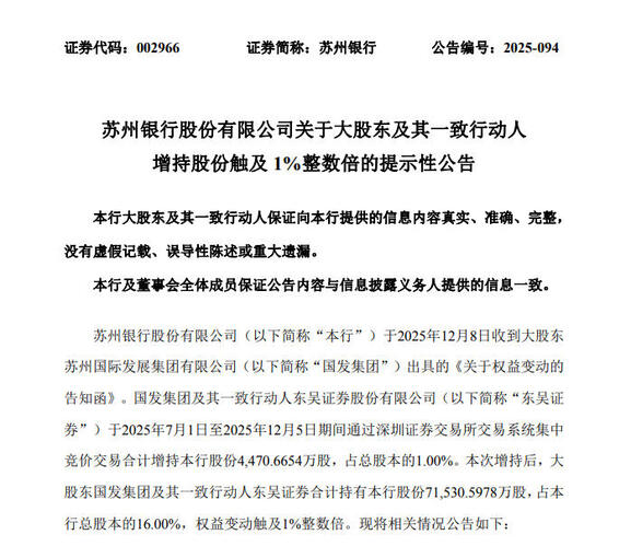 #苏州银行##增持# 苏州银行12月8日公告称,公司大股东国发集团及其一致行动人东吴证券于2025年7月1日至12月5日期间通过集中竞价交易增持公司股份4470.6654万股,占总股本的1.00%,权益变动触及1%整数倍。增持后,国发集团及其一致行动人合计持有苏州银行71,530.5978万股,占总股本的16.00%。本次增持为履行已作出的承诺,不会导致公司控制权变化。$苏州银行(SZ002966)$...