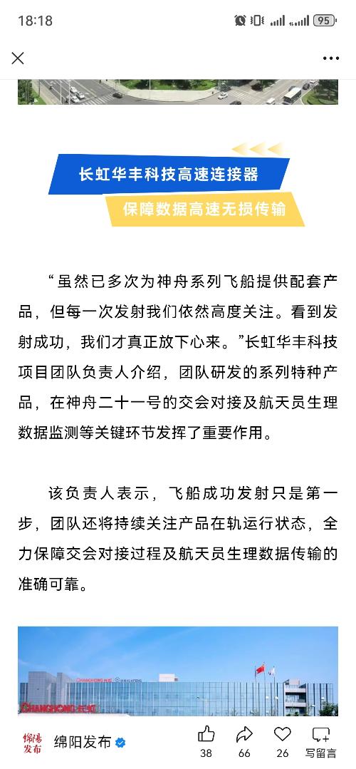 神州21号发射成功,官方公布华丰科技有极大贡献。