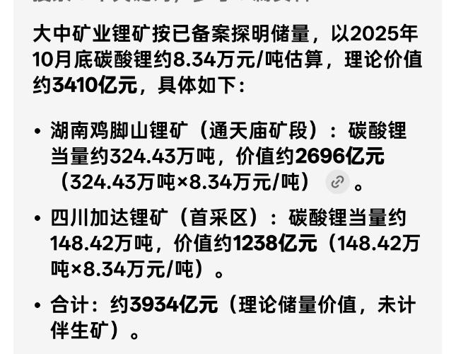 $大中矿业(SZ001203)$ 按当前锂矿价值,大中矿业的锂矿价值为三千九百亿,来自大模型的搜索结果,请问是对还是错?