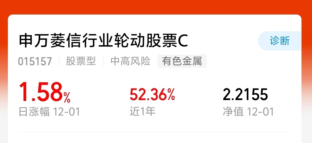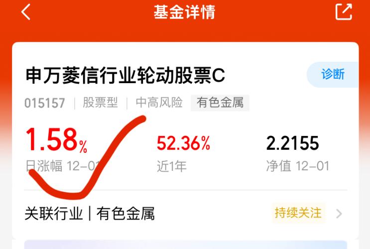 今晚纵观权益市场,有色板块无疑是最亮的仔呀,其中申万菱信行业轮动C今晚大涨1.58%,真的惊艳到我了呢,它重仓紫金矿业等优质成长股,覆盖有色金属资源核心领域,年度涨超52%,在牛市成长行情里尤其突出,我们适时分散配置一些!$路博迈资源精选股票发起C(OTCFUND|021876)$$$上银资源精选混合发起式C(OTCFUND|023449)$#12月基金投资策略#