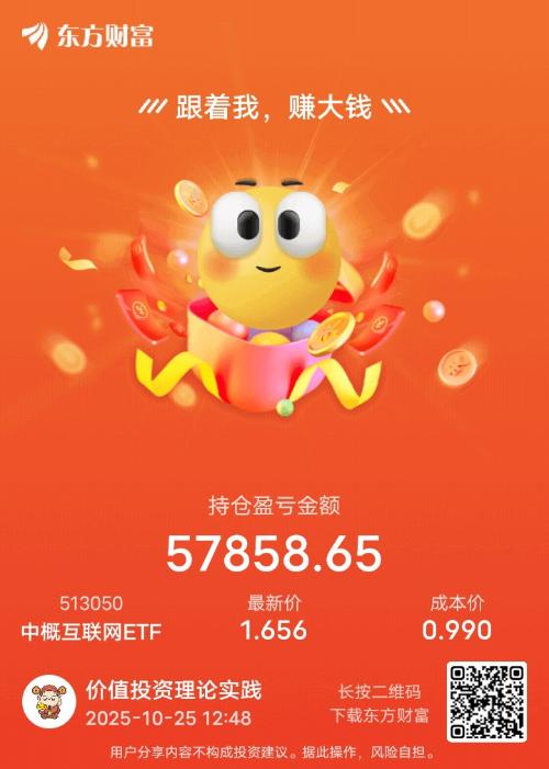 $中概互联网ETF(SH513050)$写一篇关于投资的投后感吧…分享给大家,也希望大家能真正的在股市赚到钱,并且能够靠股市挣到真真正正的碎银几两,提高生活质量,让各位的家庭更加的幸福美满。 我的投资时间点是在疫情起初(2020年正月),当时也是抱着随便玩玩的心态,实在是太无聊了。当时的投资金额也就几千块,不过赶上了科技股的热情,挣了几百块,应该是两个月后,就是吃大面了,后期就想着赚回来,又投了几...