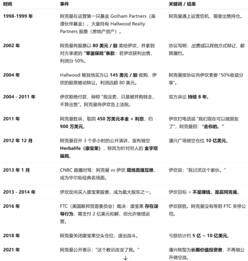 导读: 这是华尔街最有经典的多空对决:一个是相信逻辑、流程与正义的比尔·阿克曼,一个是凭直觉、强势进攻的卡尔·伊坎。 他们因为一笔早年的私人交易纠纷结下梁子,最终在Herbalife(康宝莱)这场做空大战中公开爆发。 阿克曼与伊坎的恩怨,并不是一场简单的做空与做多之争,而是两种投资世界观的正面碰撞。 阿克曼做空康宝莱,是新交易的思维: 用少量资金构建非对称收益结构,以研究与透明来触发监管,让市场认...