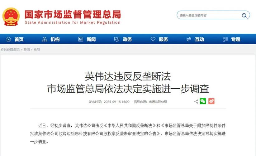 汇集全球半导体产业最新资讯技术前沿、发展趋势! 9月15日,国家市场监督管理总局发布公告称,经初步调查,英伟达公司违反《中华人民共和国反垄断法》和《市场监管总局关于附加限制性条件批准英伟达公司收购迈络思科技有限公司股权案反垄断审查决定的公告》,市场监管总局依法决定对其实施进一步调查。 受此影响,英伟达美股盘前应声下跌超2%。 (图片来源:国家市场监督管理总局网站) 据了解,该事件的起因可以追溯到2...