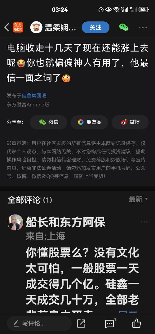 $运鸿绿色CTI(NASDAQ|YHGJ)$ 【快跑啊】阿吹进去了!马上血本无归!!正常股票一天成交起码几亿资金。硅鑫彻底没有换手,一天成交几十万【韭菜们来贴吧扣字,没有文化太可怕啦】这个名字叫温柔开头的!没有一点财经智商,我笑晕了,不停地在贴吧扣乱七八糟字,一句话。没有文化太可怕,整天是笑话!