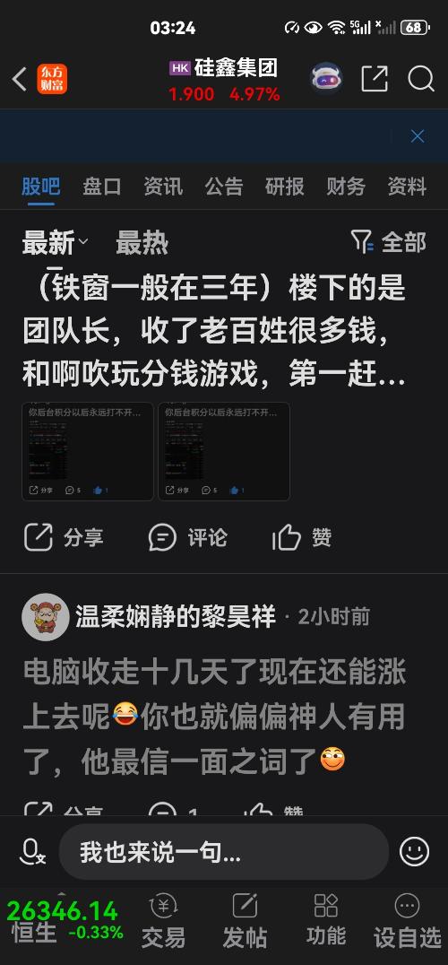 $硅鑫集团(HK|08349)$$运鸿绿色CTI(NASDAQ|YHGJ)$顾玫铭或黎昊翔等团队长及955家人们:阿保说过,中秋节后十天半个月去香港敲钟。今天是10月30日,加上今天十月还有2天。阿保现在不知所踪,既不出来直播,敲钟又没有消息,又无港交所重组停牌公告。 今日是阿保进去的第18天,我们拭目以待:相关司法部门的通告,到时候我想所有955家人都会按捺不住的。那时就是诸位的四起了。