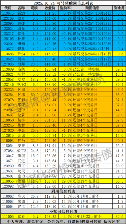 原文发送于昨日晚间自媒体。 富春转债满足赎回条件,公司宣布3个月内不赎回,投资者暂时放心。 友发转债、中环转2还差一个交易日满足赎回条件,警惕24日盘后强赎的风险,这2只让人不放心。 升24转债实施赎回,最后交易日为11月10日。 金诚转债正式发布预计满足赎回条件提示性公告,还差5个交易日满足赎回条件。 伟测转债正股不低于赎回条件价,加入赎回列表,还差13个交易日满足赎回条件。 凌钢转债正股大幅低...