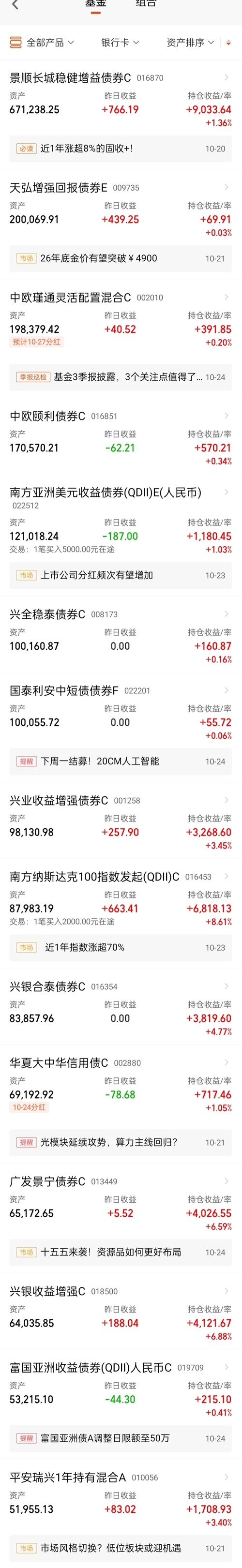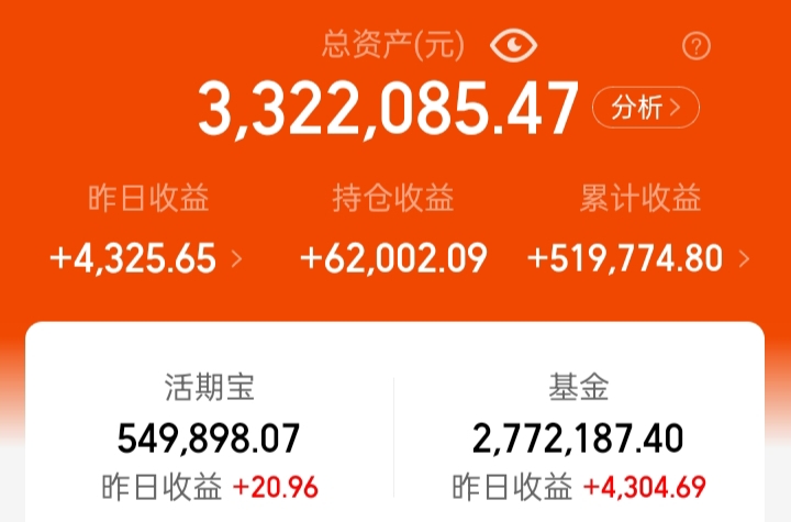 10月25【投资收益及部分持仓明细】累计收益超51.9万。昨日收益4325元。