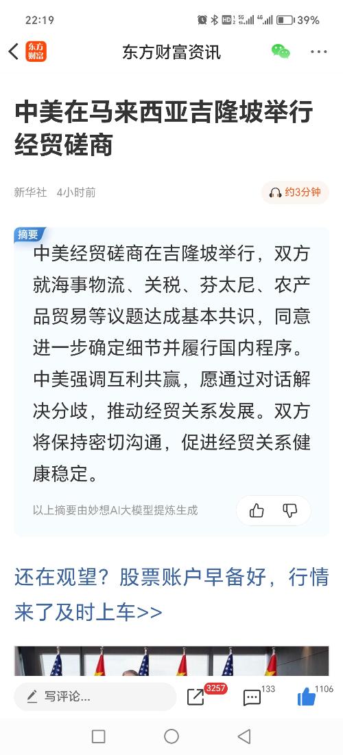 今天有个大消息。中美两边的经贸团队在吉隆坡坐下来,谈了不少事儿。美国在航运物流领域的一些限制、暂停加征关税的期限可能延长、芬太尼相关贸易问题、扩大双边贸易、还有出口管制等等,都初步有了些共识。两边都说要继续保持沟通,把经贸关系稳下来。得谢谢马来西亚张罗这场合,榴莲香里谈大事,挺有烟火气。 这事对市场当然是利好。但你要是觉得从此就能在股市里躺着数钱,那我得给你泼点冰镇柠檬水提提神,别光盯着新闻,低头...