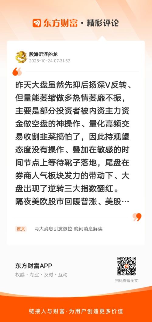 昨天大盘虽然先抑后扬深V反转、但量能萎缩做多热情萎靡不振,主要是部分投资者被内资主力资金做空盘的神操作、量化高频交易收割韭菜搞怕了,因此持观望态度没有操作、叠加在敏感的时间节点上等待靴子落地,尾盘在券商人气板块发力的带动下、大盘出现了逆转三大指数翻红。 隔夜美欧股市回暖普涨、美股大型科技股普涨和大涨,纳斯达克中国金龙指数上涨超过1.6%、中概股普涨这些都会刺激今天大盘稳定的走势,因此今天大盘高开稳...