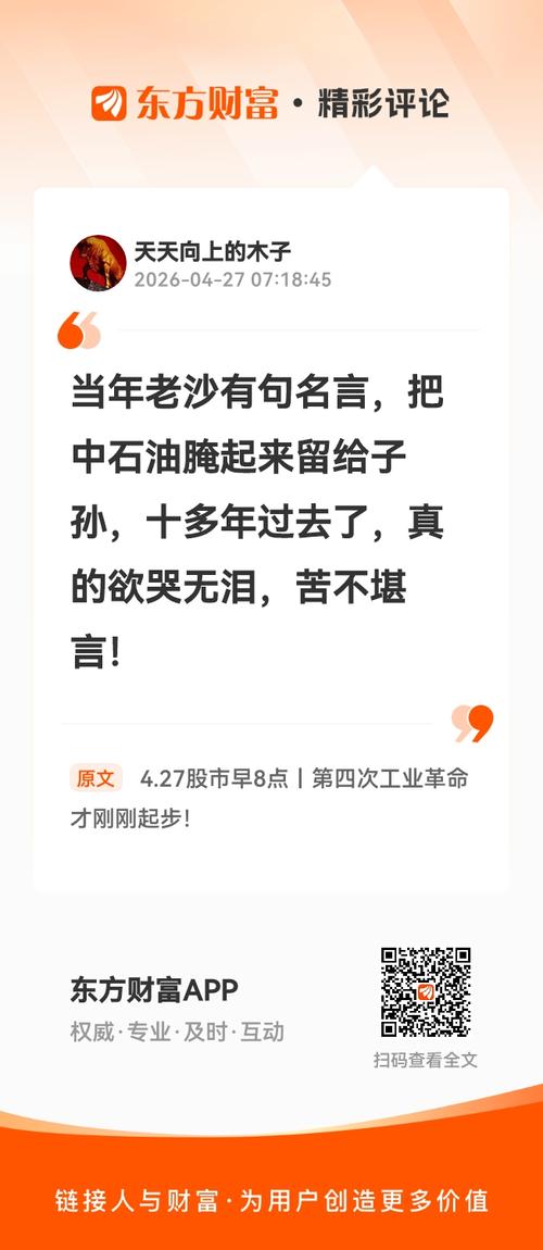 当年老沙有句名言,把中石油腌起来留给子孙,十多年过去了,真的欲哭无泪,苦不堪言! 我在《4.27股市早8点丨第四次工业革命才刚刚起步!》的评论获得了大家的关注。