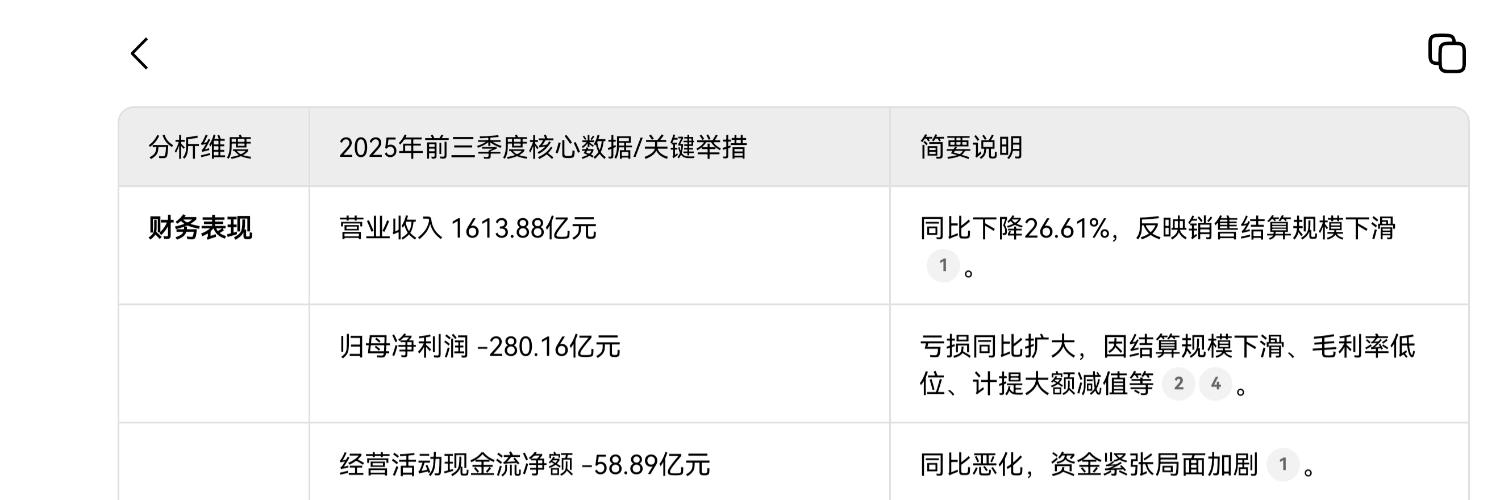 万科A2025年三季报显示公司正面临深刻的挑战。要理解其现状和未来,我们需要从多个层面进行剖析。下面这个表格梳理了核心财务指标和关键应对举措,可以帮助你快速把握概况。 分析维度2025年前三季度核心数据/关键举措简要说明 财务表现营业收入1613.88亿元同比下降26.61%,反映销售结算规模下滑。 归母净利润-280.16亿元亏损同比扩大,因结算规模下滑、毛利率低位、计提大额减值等。 经营活动现...