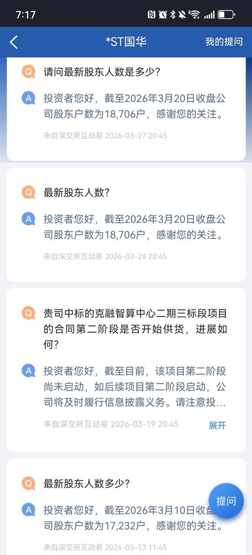 【问】最新股东人数是多少?【答】*ST国华:投资者您好,截至2026年4月10日收盘公司股东户数为17,273户,感谢您的关注。