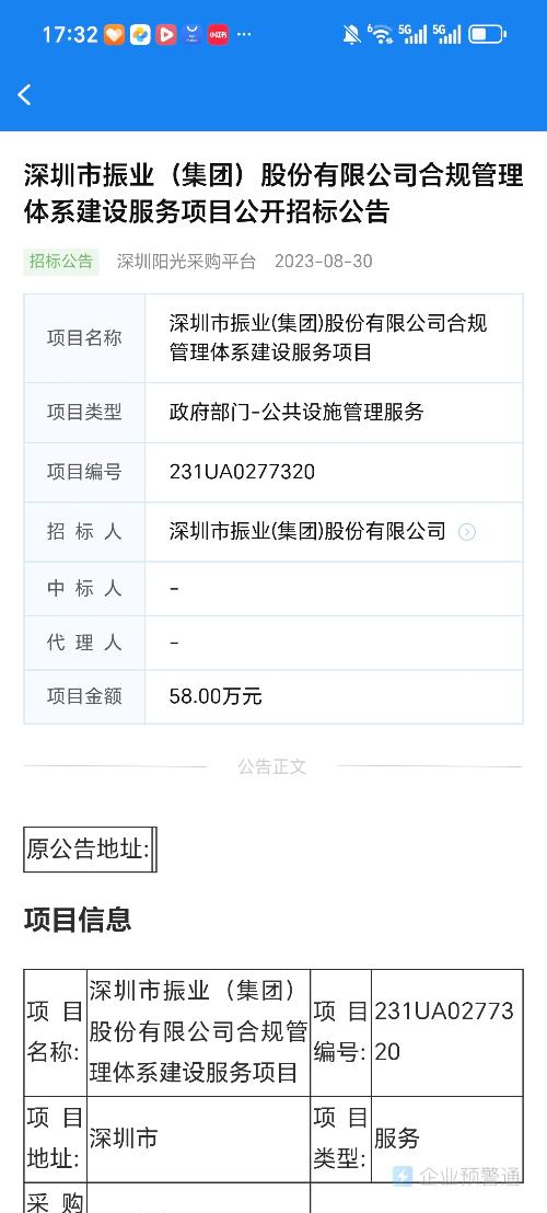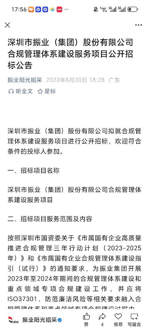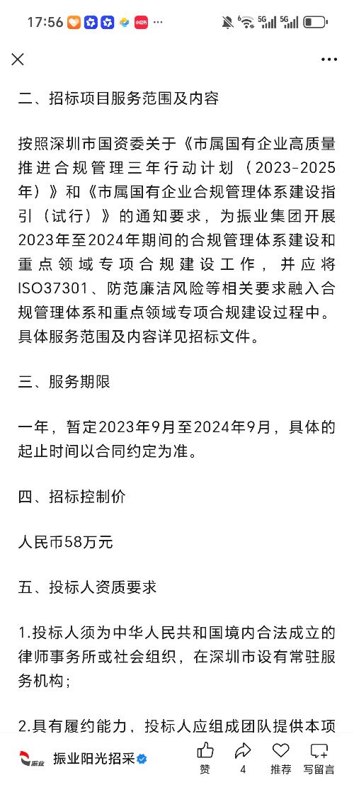 $深振业A(SZ000006)$ 振业二十八条:第二十七条开源情报-1A)--振业集团合规建设第一步--2023年9月集团合规管理体系建设服务招标(聘请律所,服务期限2023年9月至2024年9月)-- 本作品所含内容均为公开披露信息,不作为投资建议。投资者谨记投资行为三自有原则(思想自有、资金自有、盈亏自有),三自主原则(买入自主、卖出自主、仓位自主)。 平台舆情管理严格,留言请注意措辞。