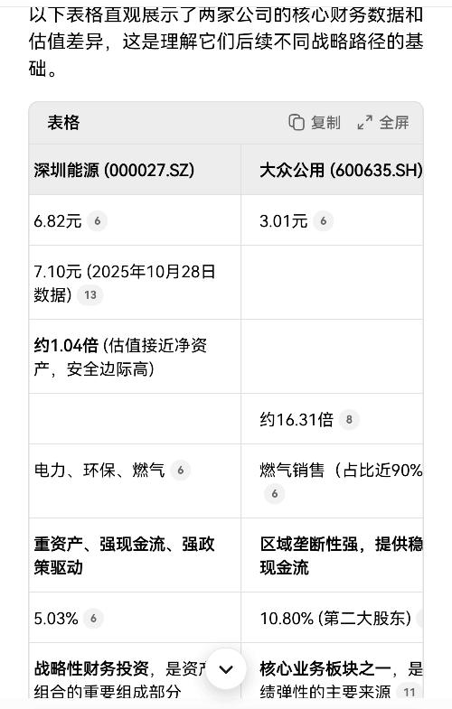 $深圳能源(SZ000027)$ $七匹狼(SZ002029)$ $大众公用(HK|01635)$ $大众公用(SH600635)$深圳能源vs大众公用:深创投股东的价值分化与战略路径 核心财务基本面与估值对比 以下表格直观展示了两家公司的核心财务数据和估值差异,这是理解它们后续不同战略路径的基础。对比维度 深圳能源(000027.SZ) 大众公用(600635.SH) 每股净资产(2025年中报...