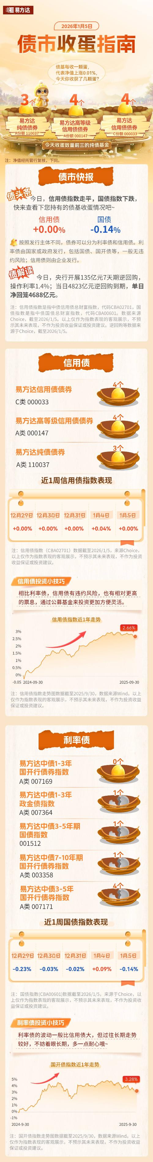 1月5日,信用债指数走平、国债指数下跌,快来查看您持有的债基收蛋情况吧!#1月基金投资策略##2026我的新年投资计划##债市收蛋指南##债市剧烈调整,何时见底?#$易方达高等级信用债债券A(OTCFUND|000147)$$易方达信用债债券C(OTCFUND|000033)$$易方达信用债债券A(OTCFUND|000032)$$易方达纯债债券A(OTCFUND|110037)$$易方达中债1-3年政金债A(OTCFUND|007364)$...