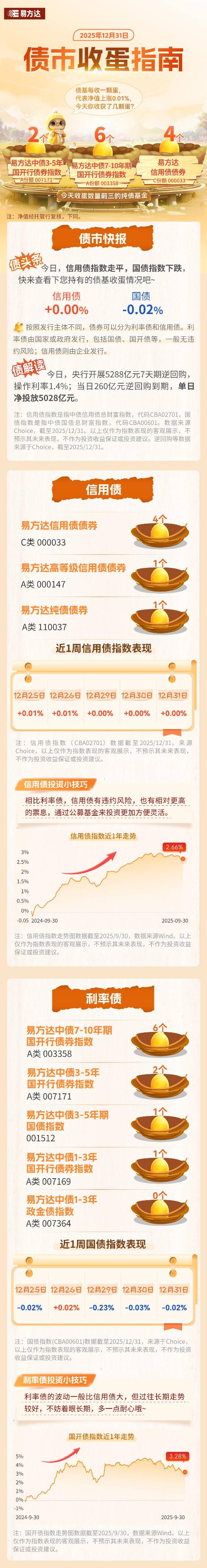12月31日,信用债指数走平、国债指数下跌,快来查看您持有的债基收蛋情况吧!#1月基金投资策略##2026我的新年投资计划##债市收蛋指南##债市剧烈调整,何时见底?#$易方达高等级信用债债券A(OTCFUND|000147)$$易方达信用债债券C(OTCFUND|000033)$$易方达信用债债券A(OTCFUND|000032)$$易方达纯债债券A(OTCFUND|110037)$$易方达中债1-3年政金债A(OTCFUND|007364)$...