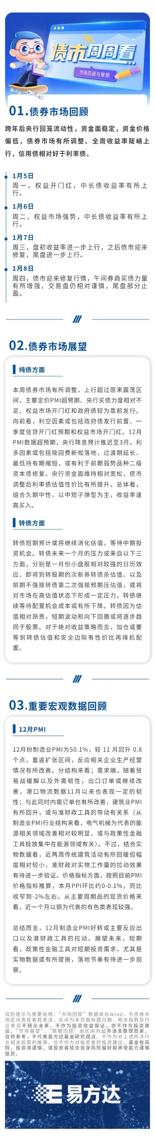 债券市场展望纯债方面本周债券市场有所调整,上行超过原来震荡区间,主要定价PMI超预期、央行买债力度相对不足、权益市场开门红和政府债较为靠前发行。向前看,利空因素或包括政府债发行前置、一季度信贷开门红预期和权益市场开门红。12月PMI数据超预期,央行降息预计推迟至3月。利多因素或包括赎回费新规落地,过渡期延长、最低持有期缩短,或有利于前期弱势品种二级资本债修复。央行资金面维持相对宽松,债市调整后利率...