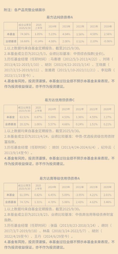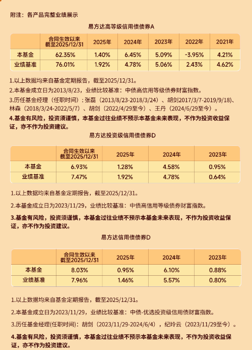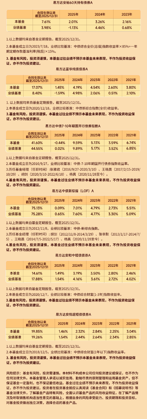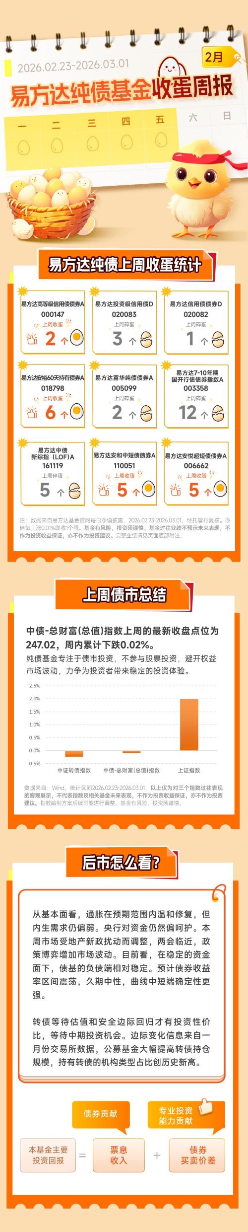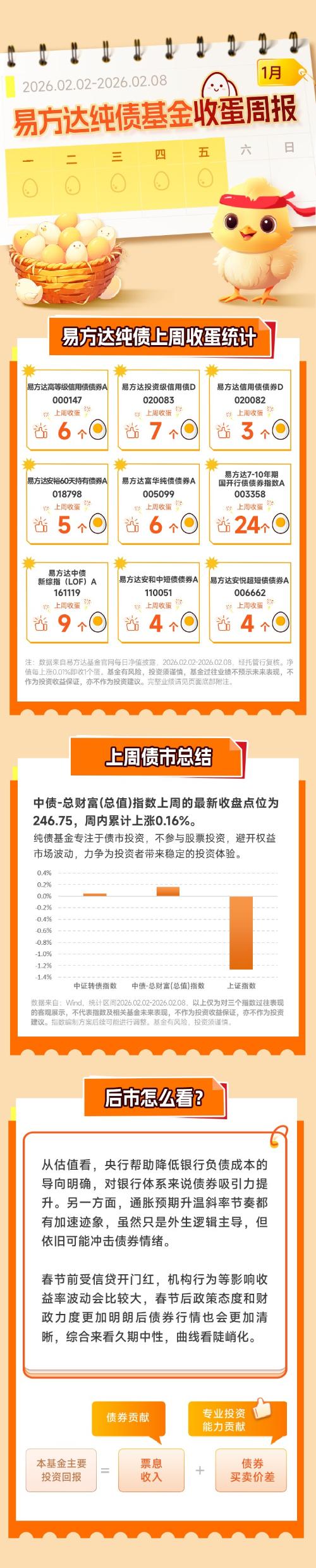 注:数据来自易方达基金官网每日净值披露,2026.02.02-2026.02.08,经托管行复核。净值每上涨0.01%即收1个蛋。基金有风险,投资须谨慎,基金过往业绩不预示未来表现,不作为投资收益保证,亦不作为投资建议。完整业绩请见页面底部附注。$易方达高等级信用债债券A(OTCFUND|000147)$$易方达信用债债券C(OTCFUND|000033)$$易方达信用债债券A(OTCFUND|000032)$...