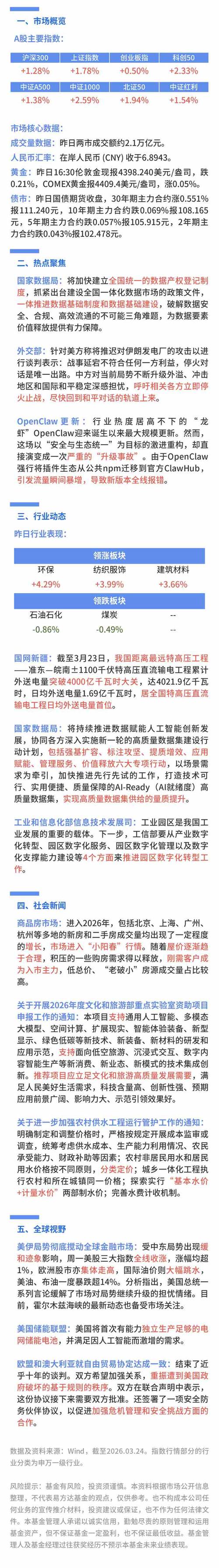 【热点聚焦】国家数据局:将加快建立全国统一的数据产权登记制度,抓紧出台建设全国一体化数据市场的政策文件,一体推进数据基础制度和数据基础建设。【行业动态】国网新疆:截至3月23日,我国距离最远特高压工程准东皖南1100千伏特高压直流输电工程累计外送电量突破4000亿千瓦时大关,居全国特高压直流输电工程日均外送电量首位。【社会新闻】商品房市场:进入2026年,包括北京,上海,广州,杭州等多地的新房和二...