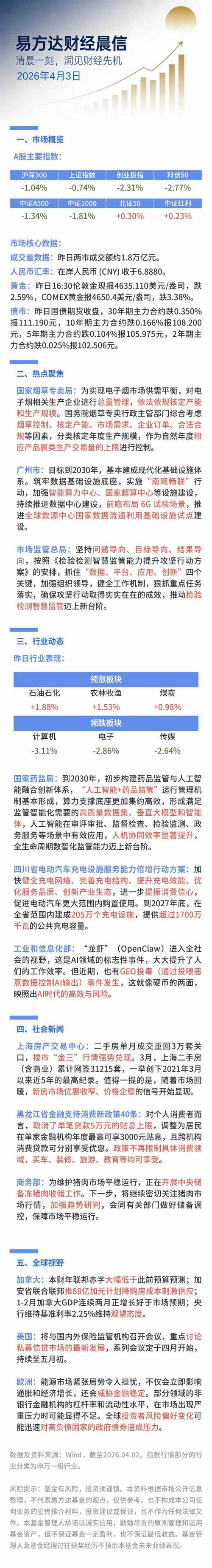 一、每日行情4月3日,市场全天震荡调整,三大指数高开低走,沪指再度跌破3900点关口。大小指数分化明显,中小盘股走势较弱。截至收盘,沪指下跌1%,深证成指下跌0.99%,创业板指下跌0.73%。北证50下跌2.12%,科创50下跌0.47%,万得全A下跌1.19%,万得A500下跌0.95%,中证A500下跌0.88%。沪深两市成交1.66万亿,上一交易日为1.86万亿。来源:Wind,截至2...