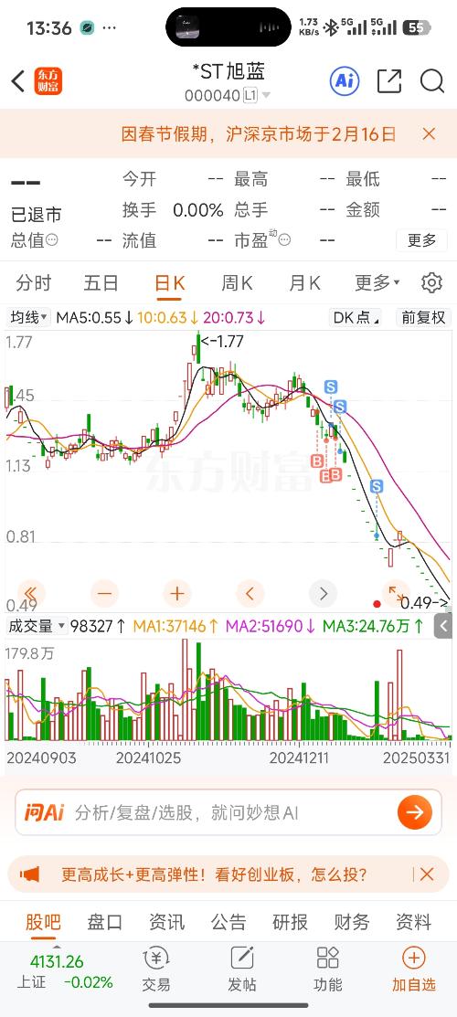 $*ST旭蓝(SZ000040)$ #炒股日记#有没有退市前杀进来还没有走的?