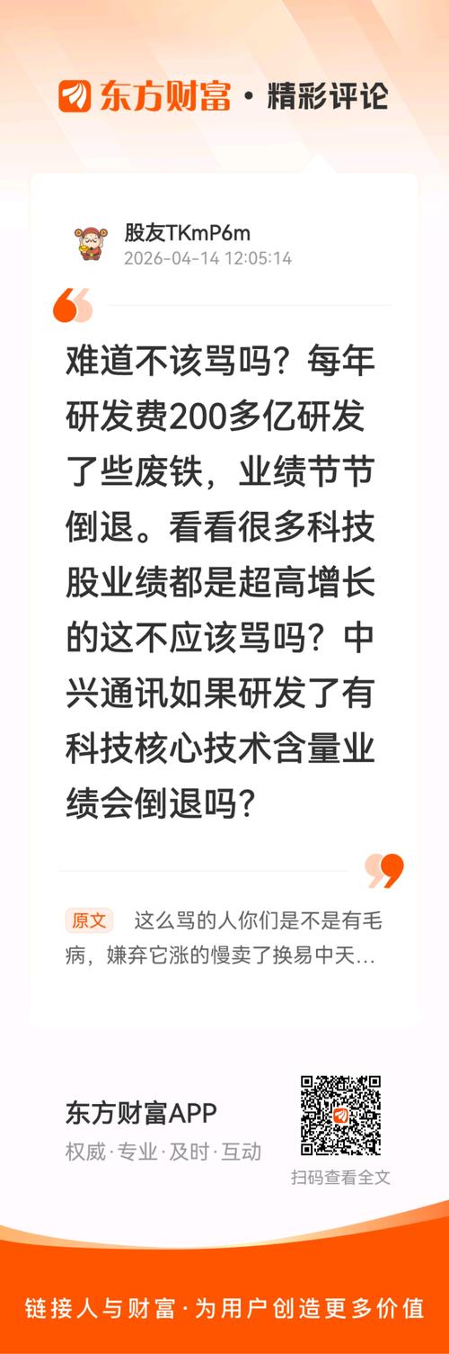 //@股友TKmP6m:难道不该骂吗?每年研发费200多亿研发了些废铁,业绩节节倒退。看看很多科技股业绩都是超高增长的这不应该骂吗?中兴通讯如果研发了有科技核心技术含量业绩会倒退吗?