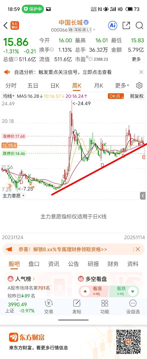 $中国长城(SZ000066)$尾盘触摸年线反弹3分,有效支撑。?