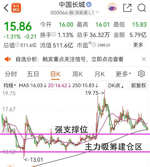 $中国长城(SZ000066)$ 中国长城(000066)从去年高点引发的调整己经13个月了,我觉得这波调整,真的到位了!看图,股价在强支撑区域反复震荡,主力悄悄吸筹,就像弹簧压得越紧,反弹越有力量! ·当前价15.86,贴近强支撑区 ·主力建仓区明确,底部特征明显 ·换手率1.13%,股价打到主力吸筹区上轨附近,资金在强支撑线悄然布局,反转就在眼前! 虽然被套15%,我还能够承受!我深知这不是偶...