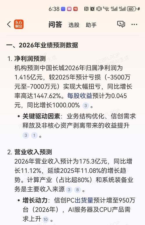 $中国长城(SZ000066)$ 一、2026年业绩预测数据 1.净利润预测 机构预测中国长城2026年归属净利润为1.415亿元,较2025年预计亏损(-3500万元至-7000万元)实现大幅扭亏,同比增长率高达1447.62%。每股收益预计为0.045元,同比增长1000.00%。 关键驱动因素:业务结构优化、信创需求释放及非核心资产剥离带来的收益提升。 2.营业收入预测 2026年营业收入预...