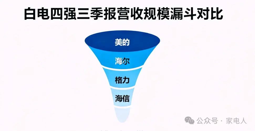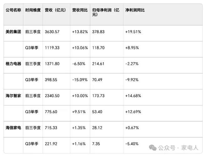 不怕不识货,就怕货比货!家电品牌也一样,上市公司实力强弱,白纸黑字的业绩报表列出来对比一下,这个不用打口水仗,谁强谁弱直接靠数字说话! 10月底,家电业美的集团、海尔智家、格力电器和海信家电中国白电四强三季报业绩出炉,呈现出美的继续快速领跑,海尔奋力追赶,海信平台调整,格力继续向下的特点。 核心财务指标:规模与增速的双重分化 从营收规模看,美的集团以较大的优势领跑,前三季度实现营业收入3630.5...