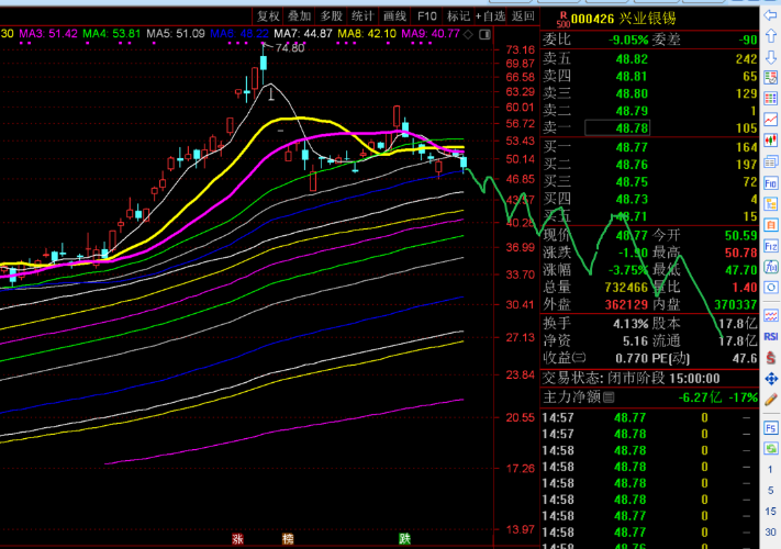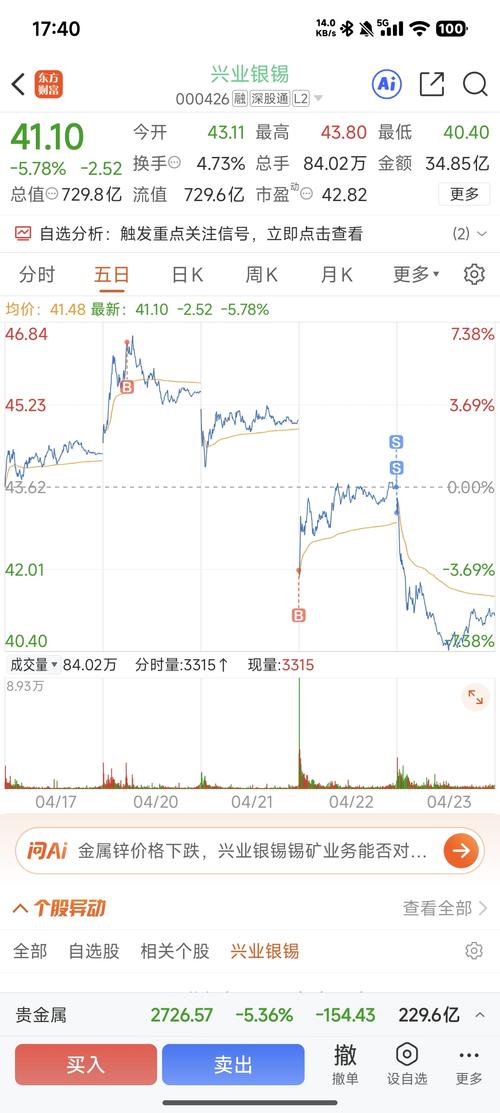 晚间话兴业银锡:今日回顾与明日展望 今日回顾:早盘43.11元开,最高冲至43.80元,最低下探40.40元,最终收盘41.10元,下跌5.78%,单日振幅7.79%,股价全天运行区间集中在40.40-43.80元。全天成交量84.02万手,金额34.85亿,换手率4.73%,量比1.47,资金活跃度较前一交易日有所回落;委比-57.22%,卖盘力量占优,内盘成交47.21万手,外盘成交36.81...