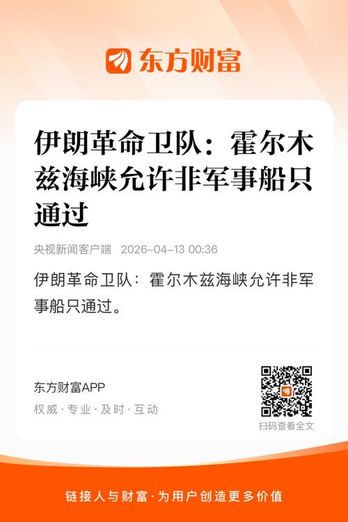 当地时间4月12日,伊朗伊斯兰革命卫队发布第59号公告,称在遵守相关特定航行准则的前提下,霍尔木兹海峡允许非军事船只通过。声明表示,任何国家的军事舰艇无论以何种名义或借口,只要试图接近霍尔木兹海峡,都将被视为违反停火协议,将遭到伊斯兰革命卫队海军严厉、强硬的回应。(央视新闻) #炒股日记##复盘记录#...
